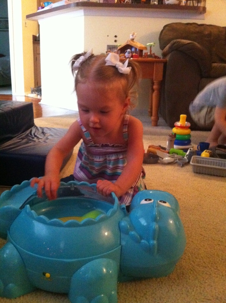 With all this cognitive development going on, Mattie had not really been “working” on her gross motor skills. Since our last post we have had quite a few ABM sessions in Gainesville and in NYC. We also started back doing cranial sacral massages. The NYC trip went very well. By the last session, Mattie was able to sit up nice and tall, hips were loose, and legs were relaxed. Since we have been back from NYC, Mattie has started to get on all fours in a crawling position all by her self. She is starting to twist her back as she roll which is the starting point to her coming into a sit and she is using her elbows for support when she props herself up. All of these new and exciting movements!! Woohoo! We are constantly trying to make her aware of her body. I am always pointing out her body parts and having her touch her knees and toes 🙂