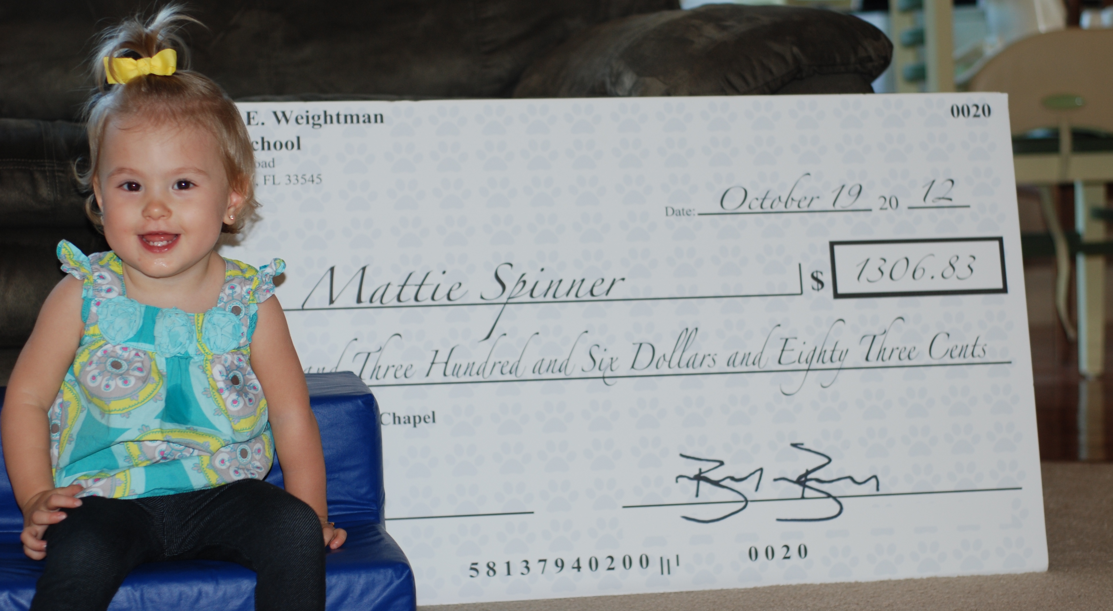 One sixth grade girl especially took the challenge to heart. She went home and told her mom that she was going to help raise money for her new friend Mattie who couldn’t walk. The girl had her mom bring her to a local bakery and bought cookies. She then set up a stand in front of the cafeteria before school every day and sold the cookies at a profit. The little girl raised $78.00 for Mattie all be herself!