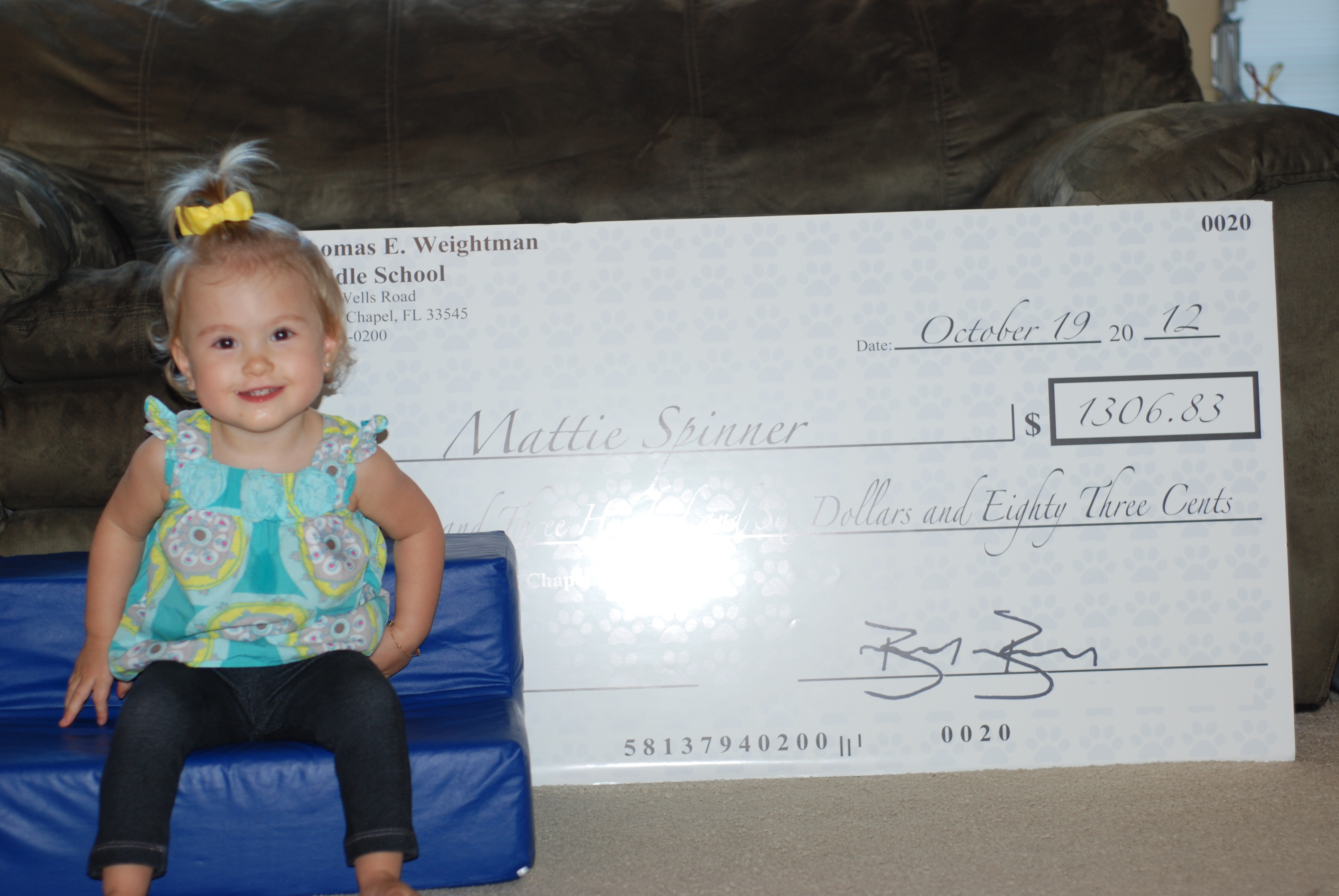 Ms. Emison, a special needs teacher who teaches at WeightmanMiddle School, (the same school as Jessica’s mom – who is also a special needs teacher) started a civics project called “Change for Mattie”. The basic idea of the project was for the students to learn how they can and should always give back to their communities in some way, shape or form – life lessons in community service! The students began by using the brainstorming process to learn how each student’s idea should go on the board without rejecting anyone’s idea. Then they discussed the different ideas on the board to determine what would be the best idea for their civic project. Many of the students had seen pictures of Mattie after she was first born and knew about all of Mattie’s doctor appointments and therapies. So when Mattie’s name came up, the class had made up their minds to ask the rest of TEWMS to help them raise money for Mattie!